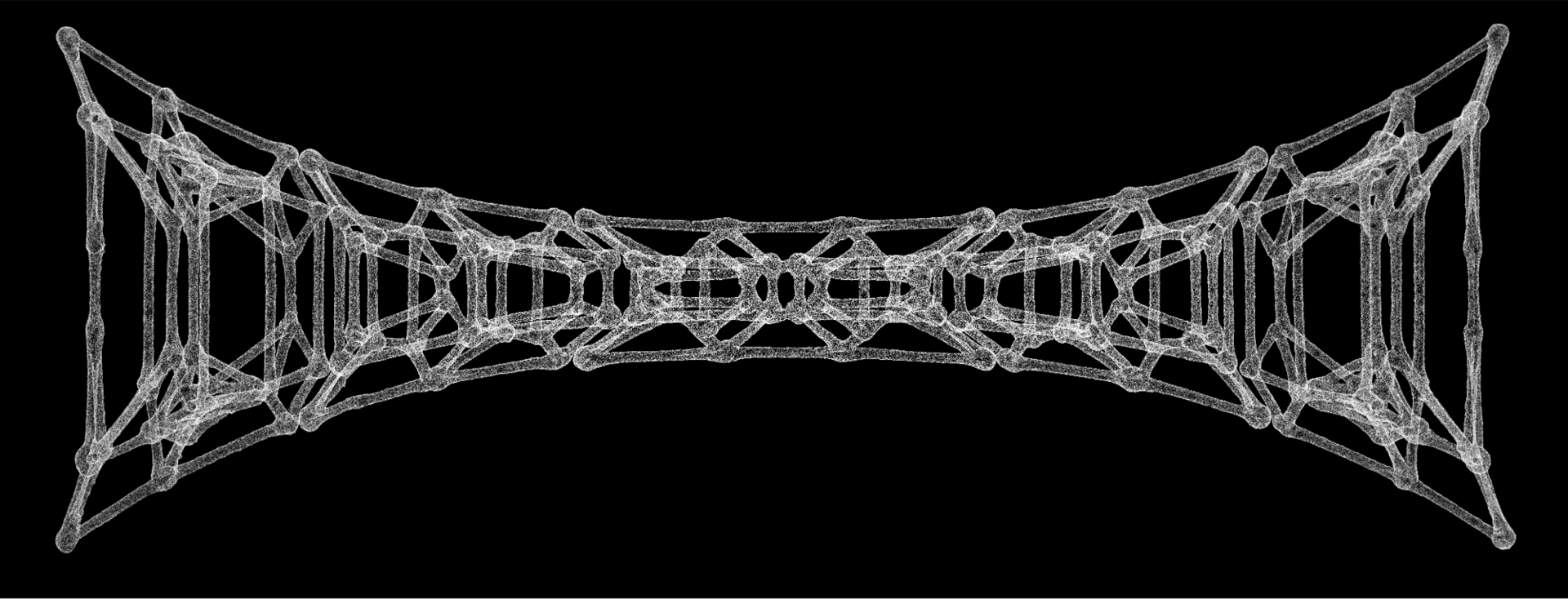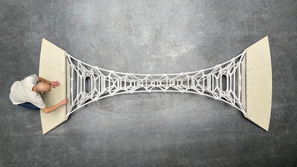 Due to robotic workspace limitations, the bridge was fabricated in five segments and subsequently assembled into a continuous structure. Measuring 4.20 meters in length and weighing approximately 312 kilograms, the bridge achieves a load-bearing capacity more than 20 times its own weight. The design was exhibited in 2023 as part of the Time Space Existence exhibition at the European Cultural Centre during the Venice Architecture Biennale.