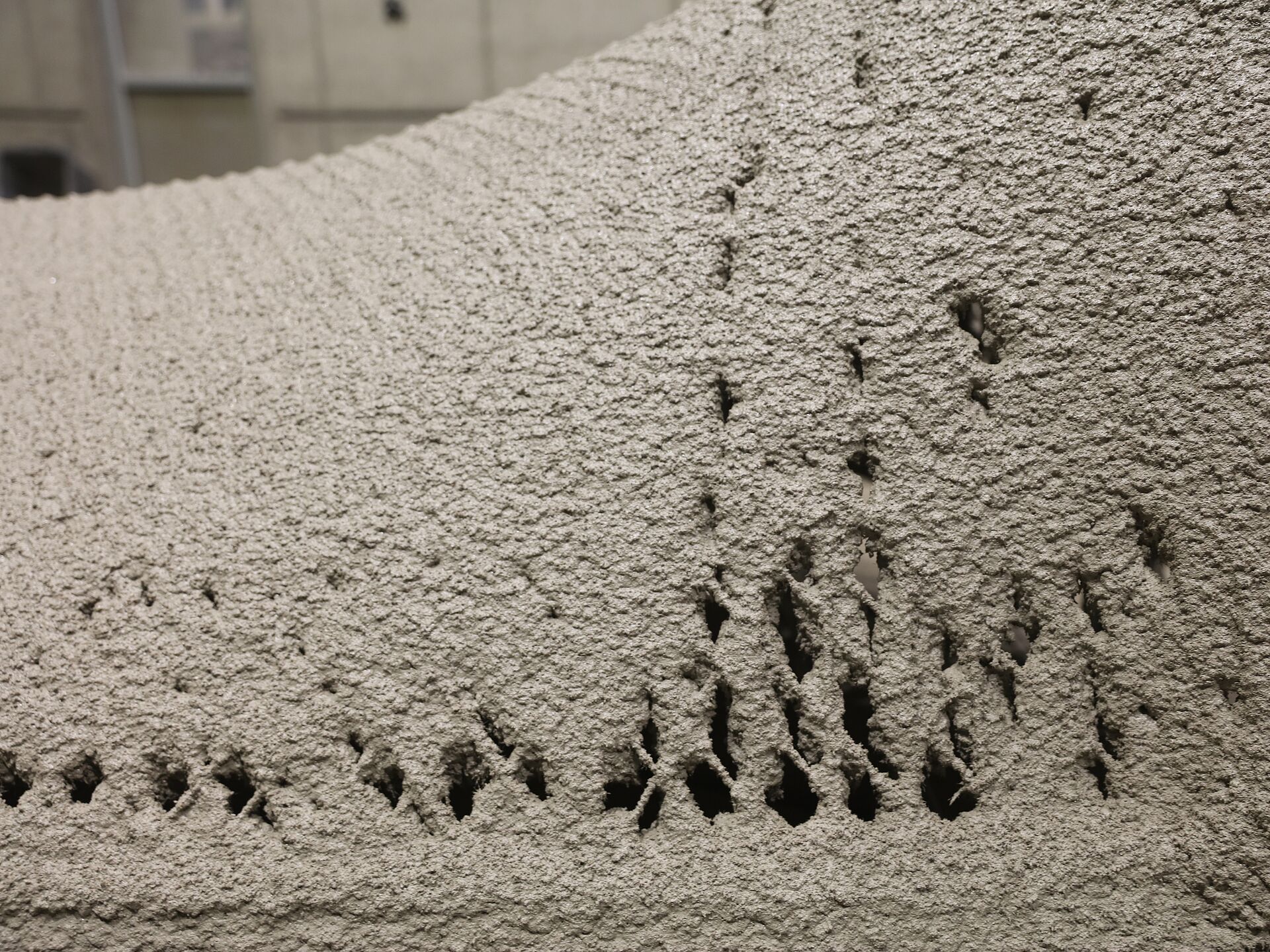 Shotcrete was then applied using the Robotic Area Shotcrete Printing method, which sprays concrete in controlled thin layers rather than stacking layers. Parametric path planning allowed real-time modulation of nozzle distance and feed rate to maintain consistent thickness and texture. While the concrete remained in its green state, CNC trimming refined the edges to form connection interfaces.
