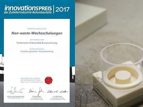 The Non-Waste-Wax-Formwork technology won the 2017 Innovation Award for the Concrete Components Supply Industry: Prof. Harald Kloft and Jeldrik Mainka from the ITE at the Technical University of Braunschweig