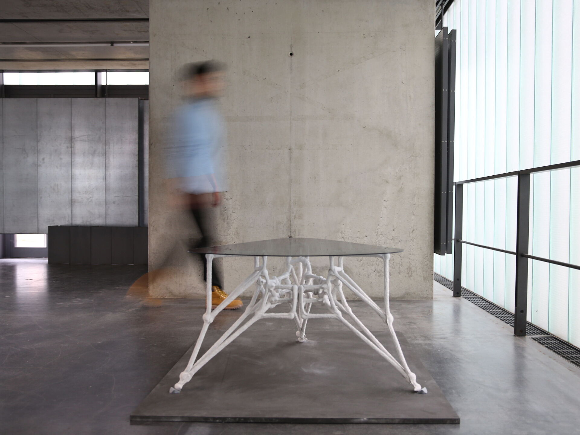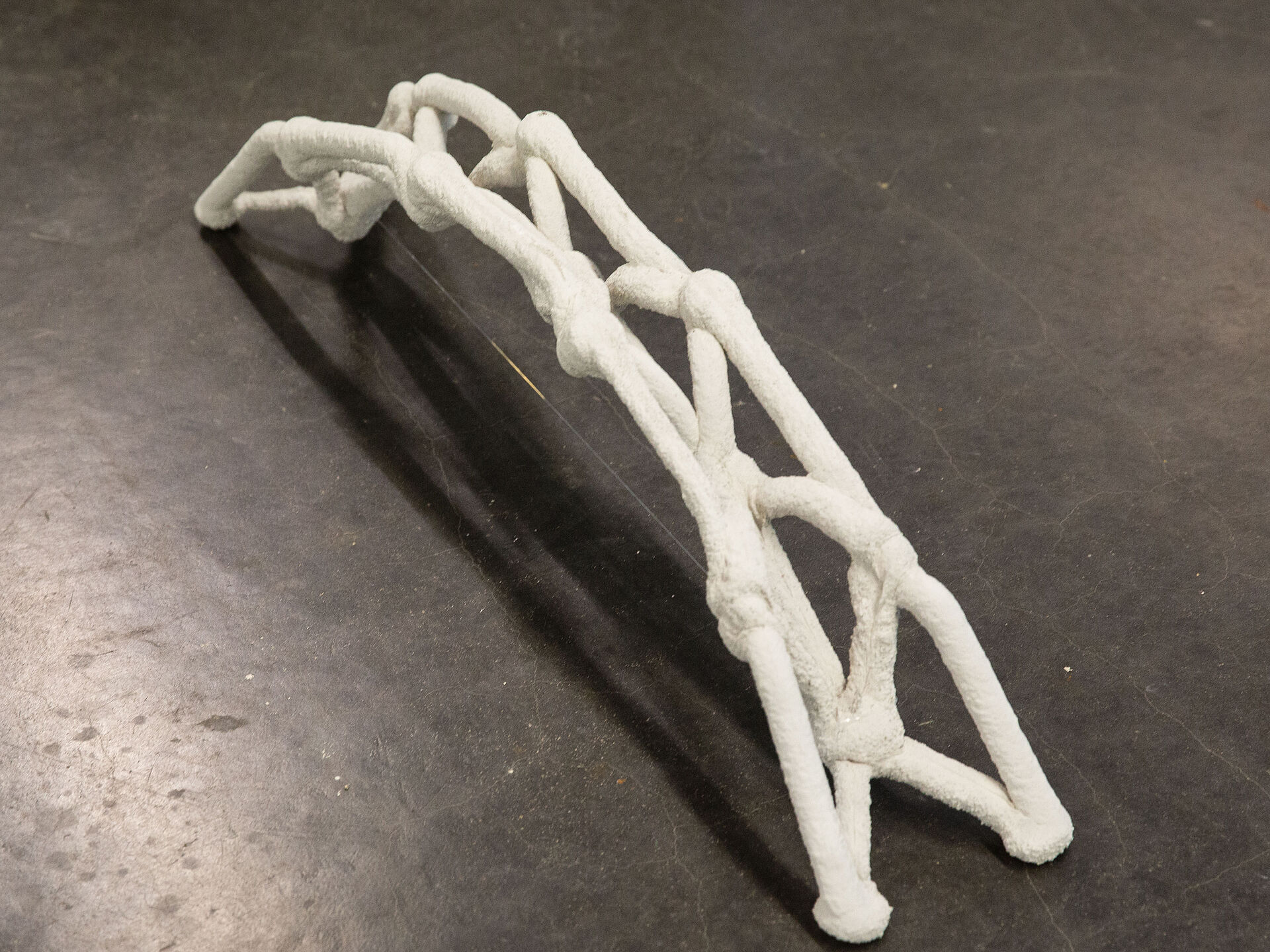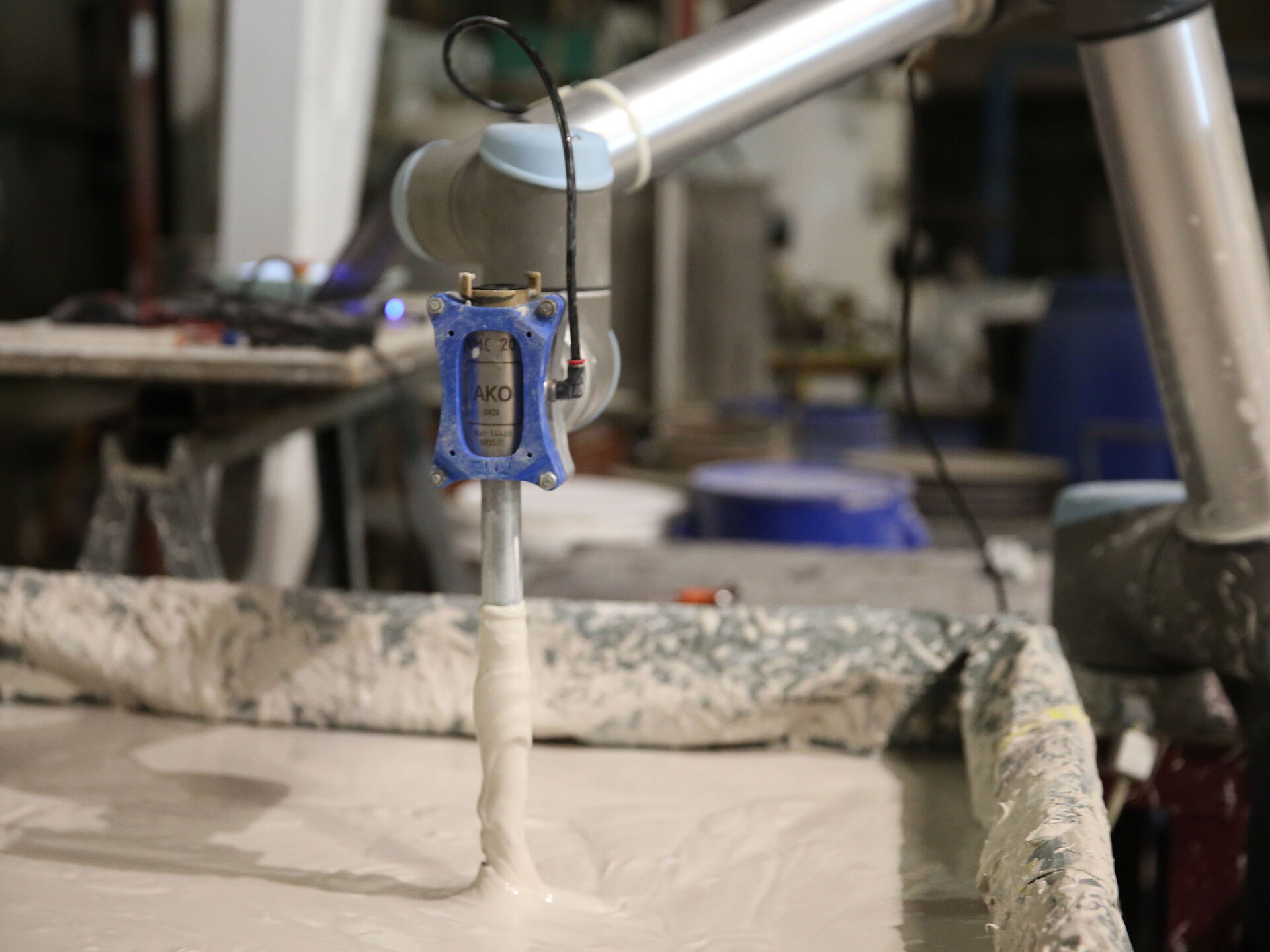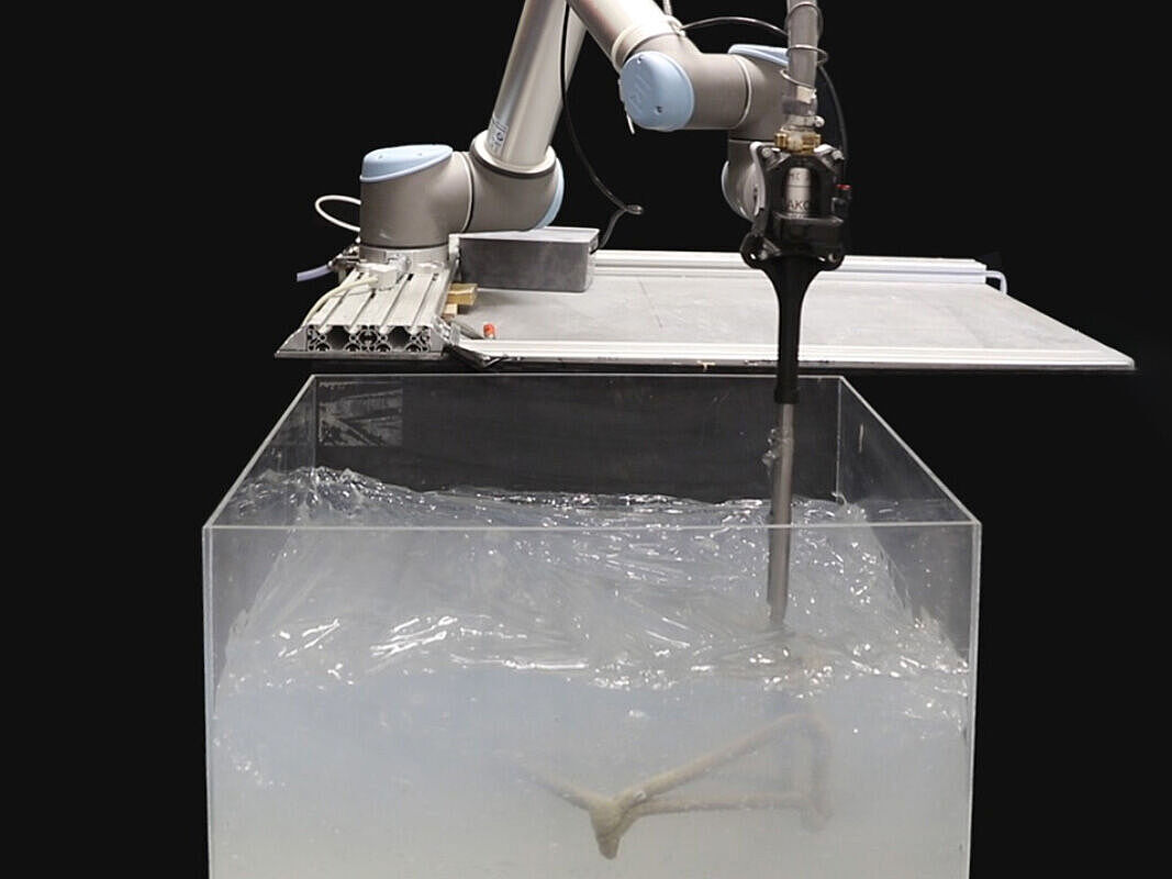 Today, the majority of research in 3D concrete printing focuses on one of the three methods: firstly, material extrusion; secondly, particle-bed binding; and thirdly, material jetting. Common to all these technologies is that the material is applied in horizontal layers. In this project, a novel 3D concrete printing technology is presented which challenges this principle: the so-called Injection 3D Concrete Printing (I3DCP) technology is based on the concept that a fluid material (M1) is robotically injected into a material (M2) with specific rheological properties, causing material M1 to maintain a stable position within material M2. Different to the layered deposition of horizontal strands, intricate concrete structures can be created through printing spatially free trajectories, that are unconstrained by gravitational forces during printing.