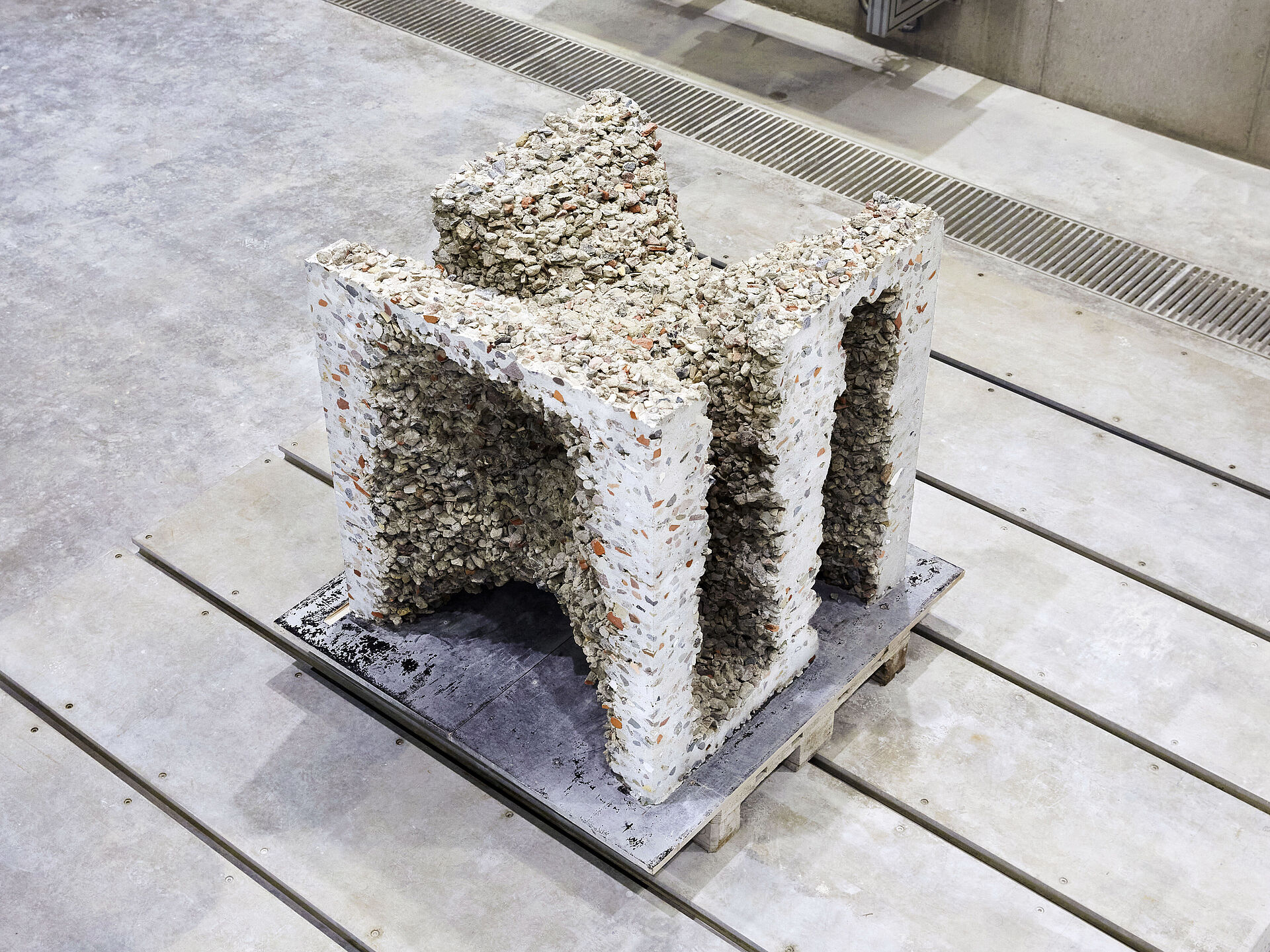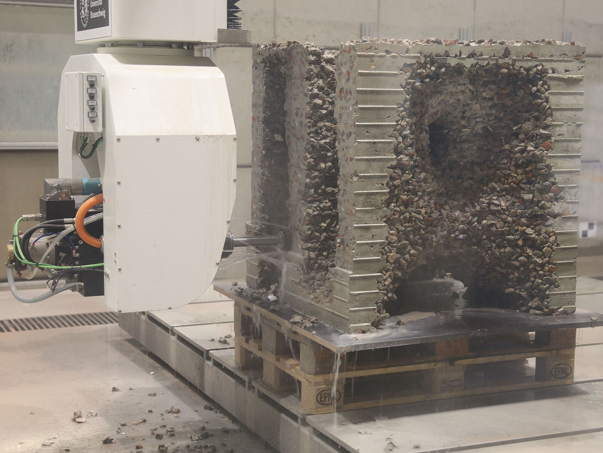The fundamental research project “Large Particle 3D Concrete Printing” (LP3DCP) explores the application of particle bed 3D printing with coarse particles in the construction industry. Similar to conventional particle bed 3D printing processes, the LP3DCP method begins by depositing a layer of coarse particles, which are subsequently locally bonded through the application of a fine-grained concrete. The fine-grained concrete is applied using a shotcrete process. These steps are repeated layer by layer until the desired three-dimensional geometry is fully produced. While existing particle bed 3D printing processes typically operate with aggregates in the micrometer or millimeter range, this project utilizes significantly larger particles, with diameters of up to 63 mm, for the particle bed. The application of the fine-grained concrete is carried out using a robot-assisted shotcrete technology developed at the Institute for Structural Design. This approach enables the fabrication of free-form, high-strength concrete elements that substantially enhance CO₂ efficiency through the use of recycled aggregates and a reduced cement content. As an interdisciplinary research initiative, the project systematically investigates the fundamental relationships between material technology, process technology, and architectural and structural desig