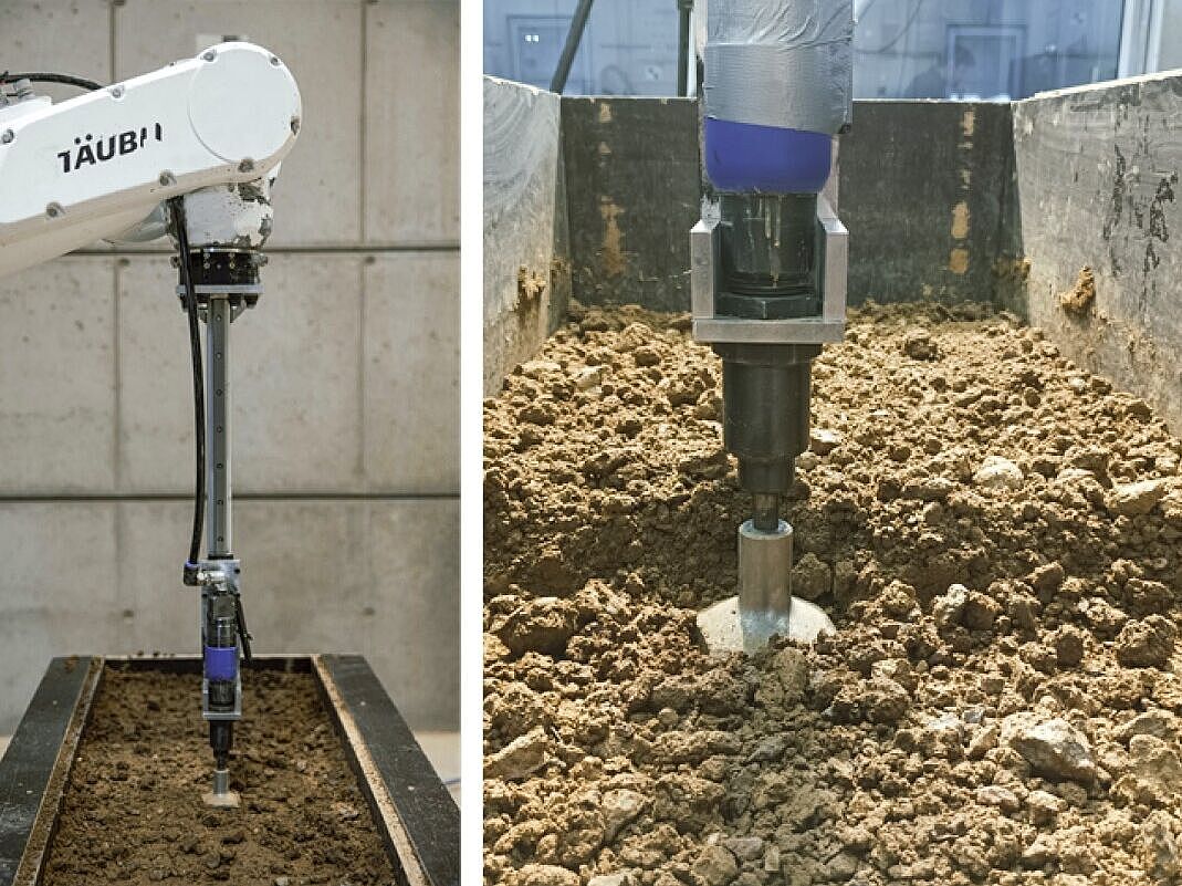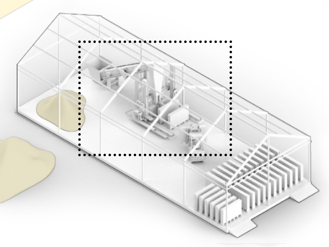 A key focus of the project is the development of a mobile robotic system capable of producing rammed-earth elements directly on site. Unlike stationary fabrication, where standardized and pre-processed materials are used, construction-site production must rely on local soils with varying properties. To enable this, the project explores automated processes for mixing, conveying, and feeding the material into the robotic compaction system. Ensuring consistent fabrication quality under variable environmental conditions—temperature, humidity, and ground composition—is an essential part of this research.