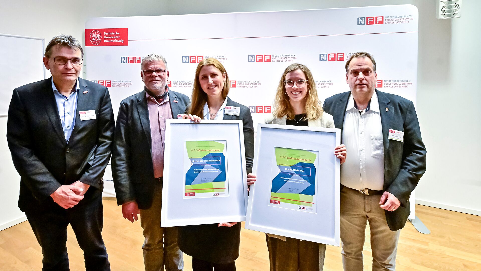 Im die Nachwuchsforschung am Niedersächsischen Forschungszentrum Fahrzeugtechnik (NFF) der Technischen Universität Braunschweig noch sichtbarer zu machen, werden alle zwei Jahre die NFF-Doktorandenpreise verliehen. Am 11. November 2025 wurden zwei Preise vergeben: Den mit 4.000 Euro dotierten ersten Platz belegte Dr.-Ing. Silvia Thal, und den mit 1.000 Euro dotierten zweiten Platz Dr. Joana M. Warnecke. Beide Dissertationen widmen sich der Mobilität der Zukunft. Silvia Thal behandelt in ihrer Dissertation den Aufbau einer grundlegenden Methode zum Sicherheitsnachweis von hochautomatisierten Fahrfunktionen, Joana Warnecke hat ein Konzept zum kontinuierlichen Gesundheitsmonitoring durch verschiedene Mobilitätsträger entwickelt.