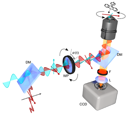 In general, the detection of fluorescence polarization is an extremely widespread approach to gain important mechanistic or structural insights from fluorescenctly labelled samples. Binding interactions are very widely monitored using fluorescence polarization. Also, important structural information can be derived from fluorescence labels when they have different preferred orientations at different structural regions. Active sites that are undergoing conformational changes can be monitored in real time when rigidly attached labels maintain their relative orientation. However, the fluorescence emission of emitters having a fixed orientation generally follows a rather unspecific cos²- angle dependence (Figure). As a matter of fact, overlapping emissions of several different emitters of different angles will always lead again to a cos²- angle dependence as mathematically adding cos² functions of different phases will again lead to a cos function.