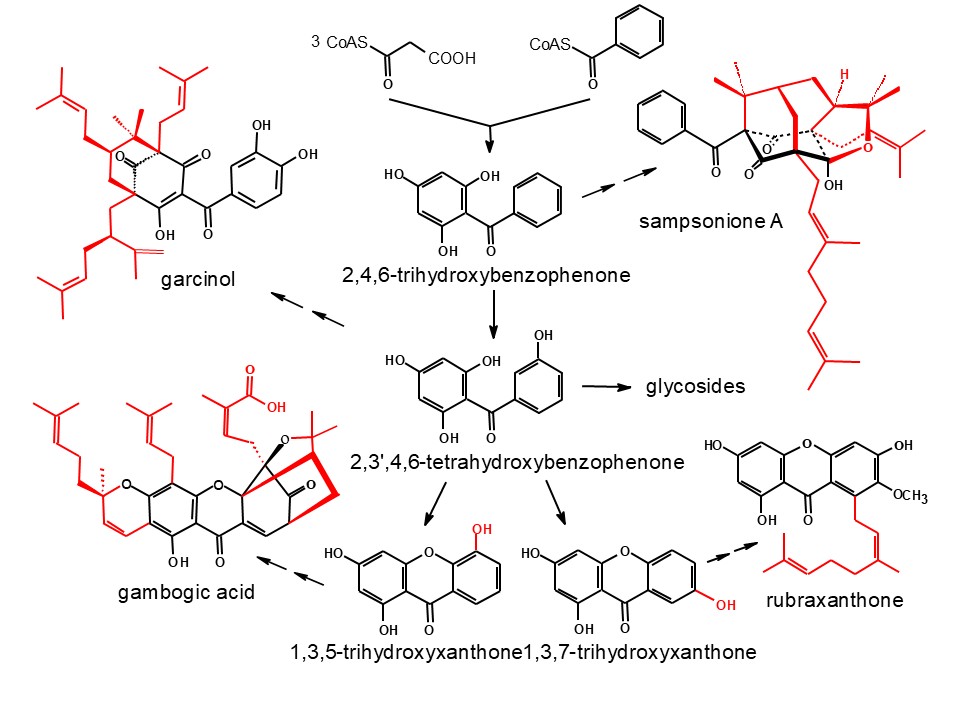 Das Grundgerüst der Benzophenone wird aus Benzoyl-CoA und drei Molekülen Malonyl-CoA gebildet, katalysiert durch die Benzophenon-Synthase. Eine Punktmutation in dieser Typ III-Polyketid-Synthase öffnet eine neue Tasche im aktiven Zentrum und überführt das Enzym in eine Phenylpyron-Synthase. Neben Glykosidierung und Dimerisierung erfahren einfache Benzophenone schrittweise Prenylierungen mit C5 oder C10-Seitenresten und begleitende Zyklisierungen, woraus PPAP resultieren. Die beteiligten Prenyltransferasen sind integrale Membranproteine, die sich in der Hülle von Chloroplasten befinden.