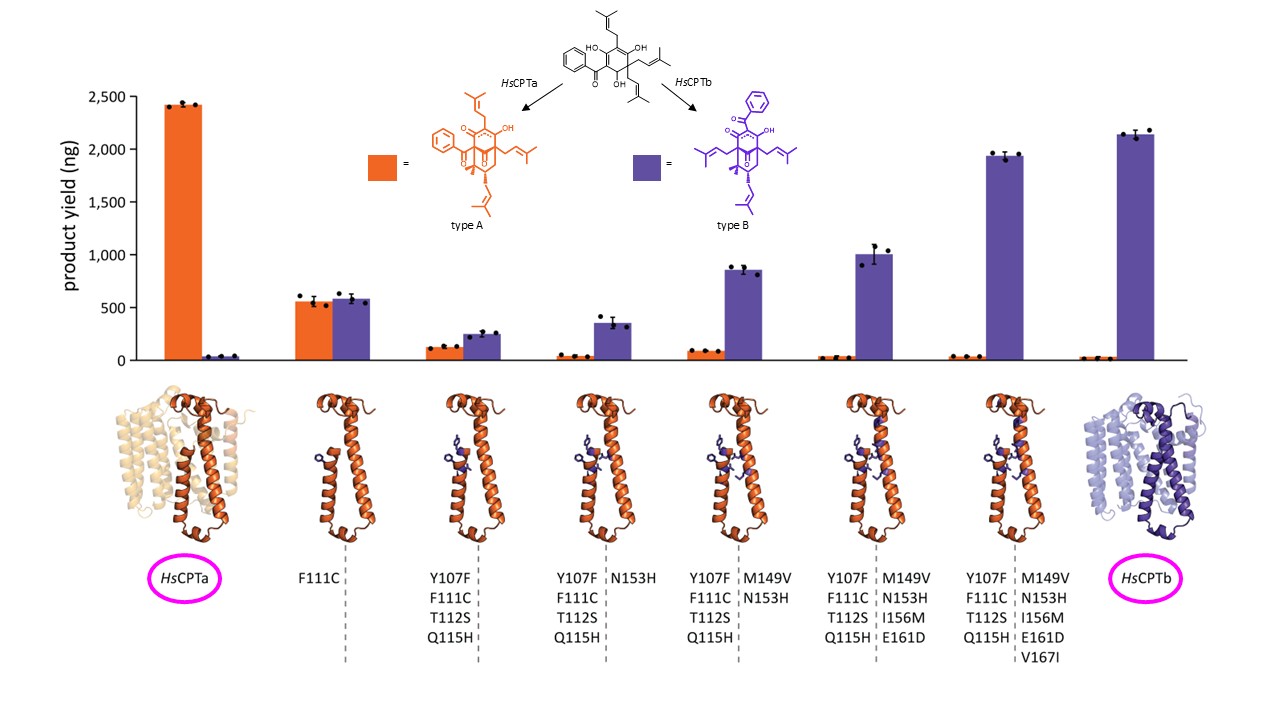 PPAP existieren in zwei Konstitutionen, die als Typ A und B bezeichnet werden. Kürzlich haben wir ein Paar von bifunktionalen Prenyltransferasen identifiziert, die regiodivergente prenylative Zyklisierungen katalysieren, aus denen Typ A und B Regiomere hervorgehen. Molekulare Modellierung und Docking sagten invertierte Substrat-Bindungsszenarien in den zwei aktiven Zentren voraus. Eine reziproke Mutagenese zeigte, dass die regiospezifischen Bindungsmodi durch Neunfach-Mutation interkonvertierbar sind. Die übertragenen Prenylgruppen haben endo-Konfiguration, welche für die nachfolgende Biosynthese von käfigartigen Adamantan-PPAP erforderlich ist.