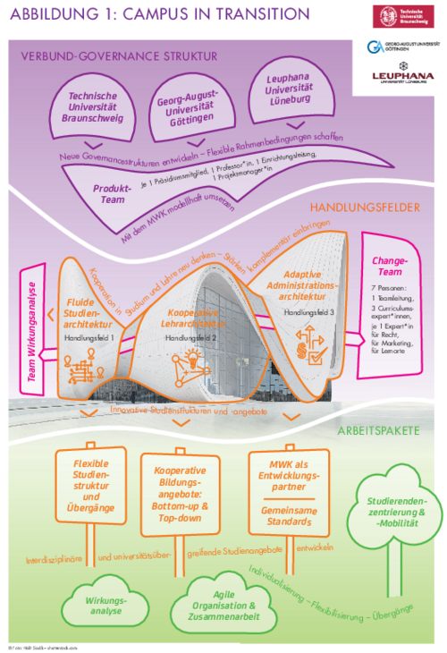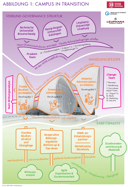 Das gemeinsame Projekt „Campus in Transition“ der TU Braunschweig, der Universität Göttingen und der Universität Leuphana Lüneburg wird von der Stiftung Innovation in der Hochschullehre in der Ausschreibung „Lehrarchitektur: Hochschule der Zukunft gestalten“ mit einem Gesamtfördervolumen von 12,8 Mio. Euro gefördert.