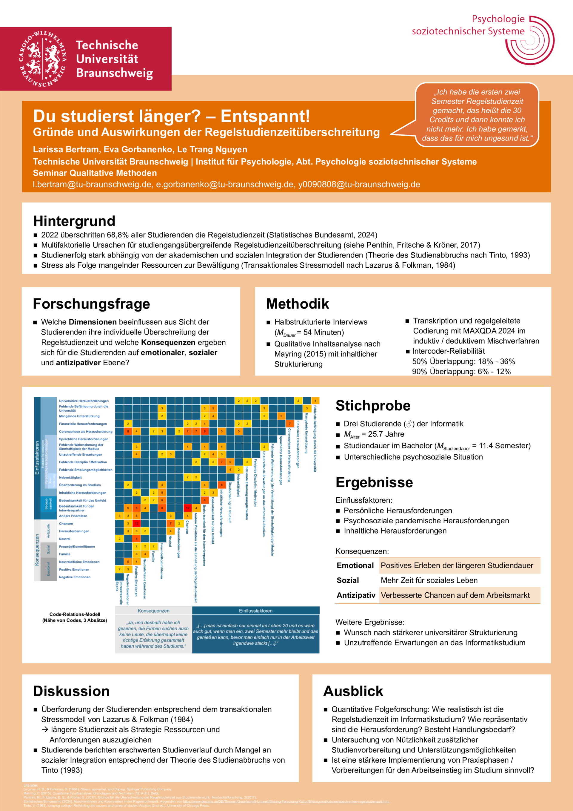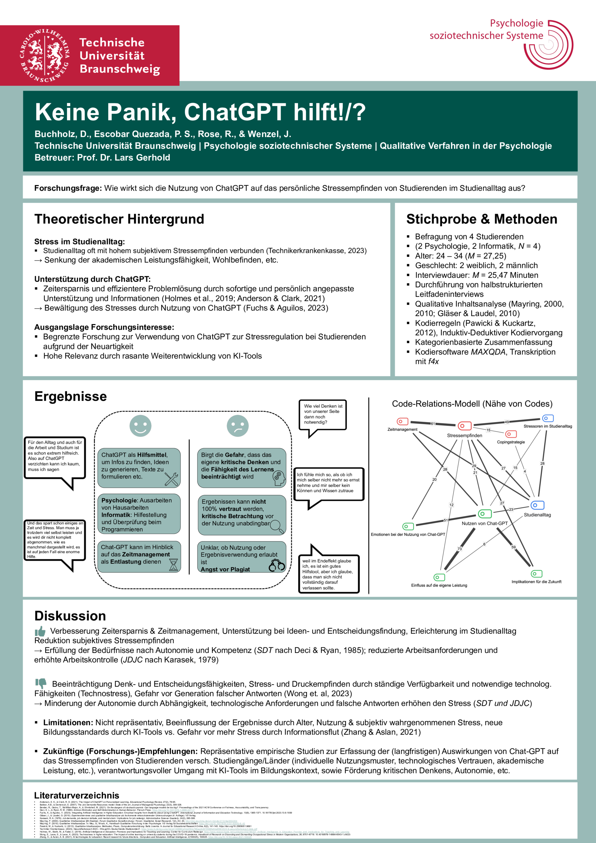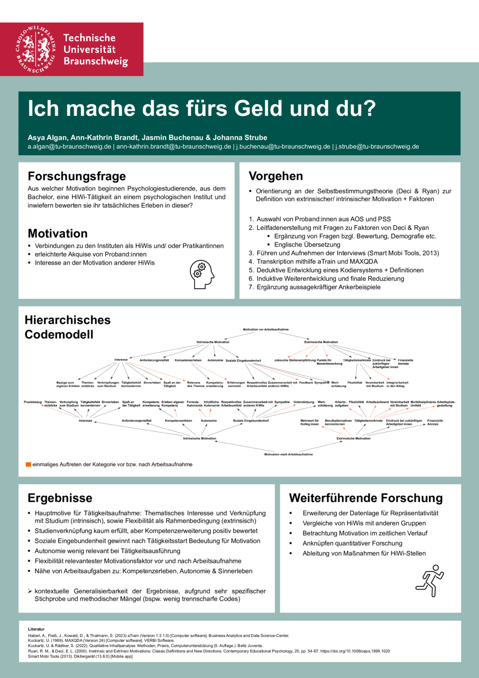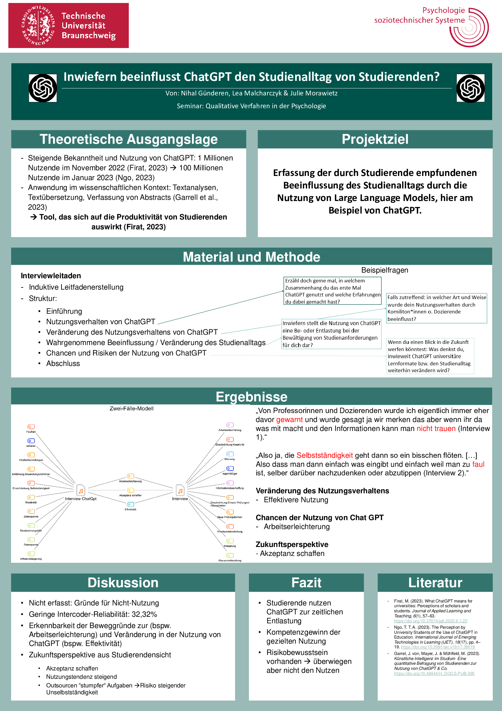 Im Master Seminar "Qualitative Verfahren in der Psychologie" lernen unsere Studierenden den Umgang mit qualitativen Daten - sei es die Erhebung, die Auswertung, und aber auch deren Präsentation. Es galt einen Überblick zu schaffen über die existierenden Methoden, Gütekriterien der qualitativen Forschung, aber auch eben die praktische Arbeit: Wie erstelle ich einen Interviewleitfaden? Was mache ich mit MAXQDA? Wie funktioniert die Gutachterübereinstimmung?