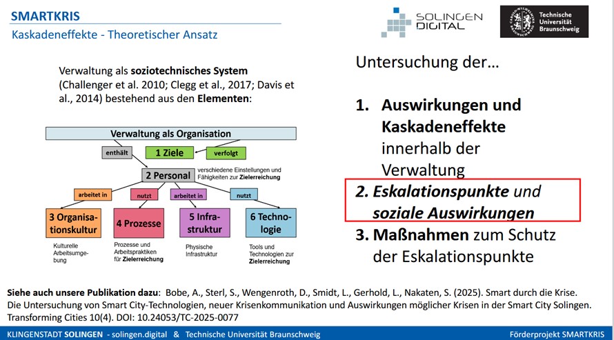 Im Anschluss stellten Lea Smidt und Dennis Wengenroth das Thema der Krisenkommunikation vor, während Sebastian Sterl Ergebnisse zu Kaskadeneffekten und sozialen Auswirkungen präsentierte. Anja Bobe von Solingen.digital führte live durch das „Krisenkommunikation Steuerungs-Cockpit“ der Stadt Solingen.