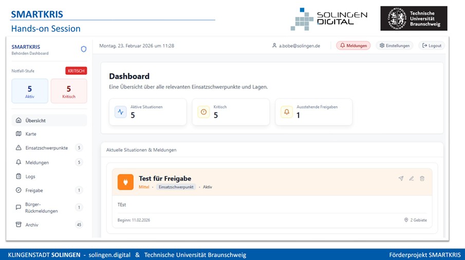 Im Rahmen des BMFTR-geförderten Projekts SMARTKRIS fand am Montag ein Arbeitstreffen zwischen der TU Braunschweig (TUBS), Klingenstadt Solingen sowie dem assoziierten Partner der Stadt Braunschweig vertreten durch Tobias Pollmann (Dezernent Personal-, Feuerwehr-, Ordnungs- und Digitalisierungsdezernat), Henning Sack (Leiter Fachbereich Zentrale Dienste), Dirk Hollenbach (Leiter Abteilung Informations- und Kommunikationstechnologie) sowie Torge Malchau (Leiter der Berufsfeuerwehr Braunschweig) statt.