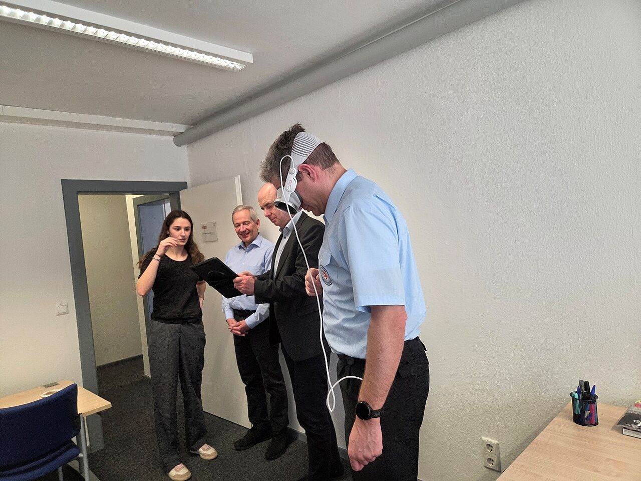 Nach einer Besichtigung des Gebäudes leiteten DRK-Mitarbeiter:innen Sina Giesemann und Sarah Horváth in die Thematik ein und testeten das entworfene, standardisierte PSNV-Einsatzprotokoll gemeinsam mit PsychoKat-Mitarbeiter der TU Braunschweig Sebastian Sterl und Imanuel Aurich vom DRK in vier verschiedenen Szenarien an den PSNV-Einsatzkräften.