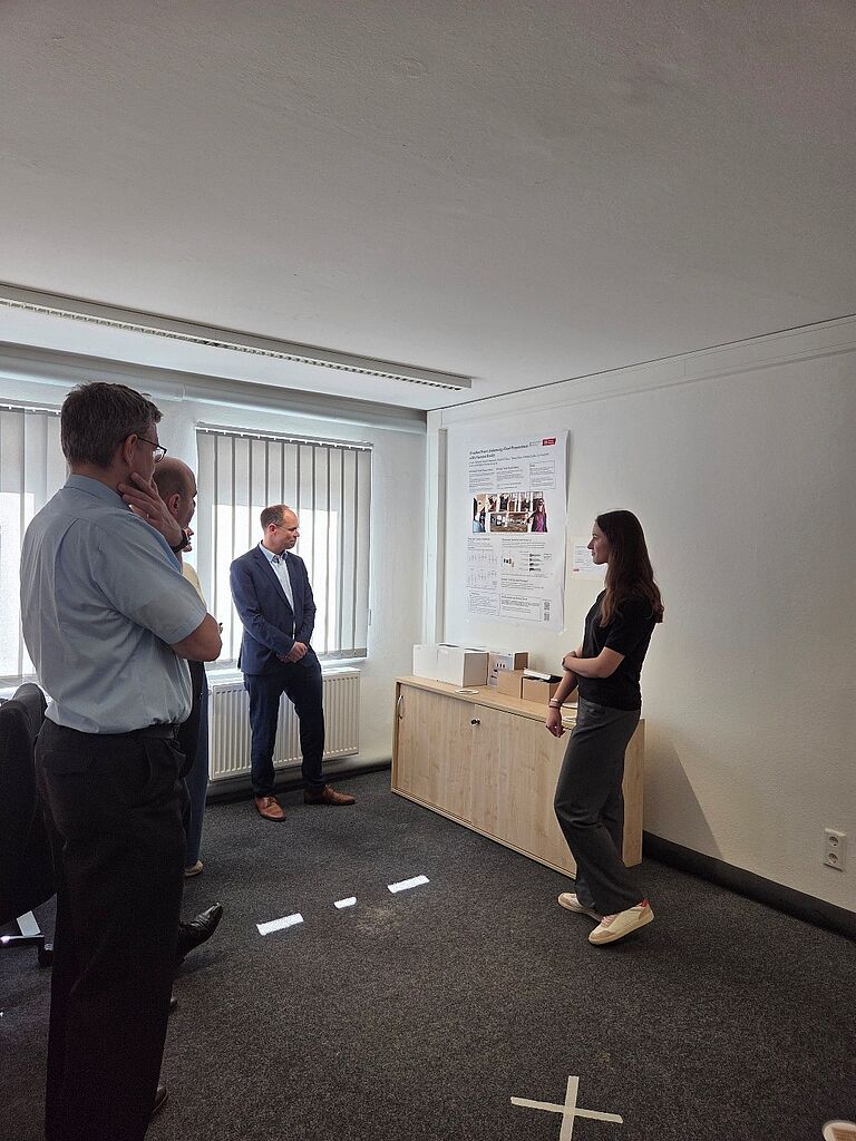 Leonie Terfurth stellte laufende Forschungsarbeiten zu VR-gestützten Evakuierungsszenarien vor. Ziel des Projekts ist es, Wissenslücken in Bezug auf Unterschiede zwischen experimentellem und tatsächlichem Verhalten von Menschen in Evakuierungssituationen zu verringern. Die Forschung findet in Zusammenarbeit mit Simon Burkard (Fraunhofer FOKUS) statt.
