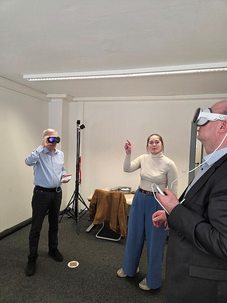 Leonie Terfurth hat zahlreichen Interessierten auf der Vision Pro Brille die AR Anwendung „Troubled Water“, ein Gemeinschaftsprojekt der Technische Universität Braunschweig, Abt. Psychologie soziotechnischer Systeme, und des Weizenbaum-Institut e.V. (dort Anna Heidenreich), testen lassen. „Troubled Water“ simuliert ein Hochwasserereignis in der eigenen Umgebung und bringt Nutzenden außerdem spielerisch Wissen über Notfallvorsorge näher.