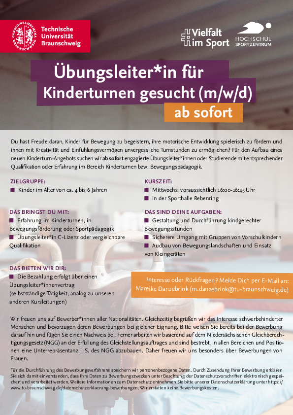 Du hast Freude daran, Kinder für Bewegung zu begeistern, ihre motorische Entwicklung spielerisch zu fördern und ihnen mit Kreativität und Einfühlungsvermögen unvergessliche Turnstunden zu ermöglichen? Für den Aufbau eines neuen Kinderturn-Angebots suchen wir ab sofort engagierte Übungsleiter*innen oder Studierende mit entsprechender Qualifikation oder Erfahrung im Bereich Kinderturnen bzw. Bewegungspädagogik.