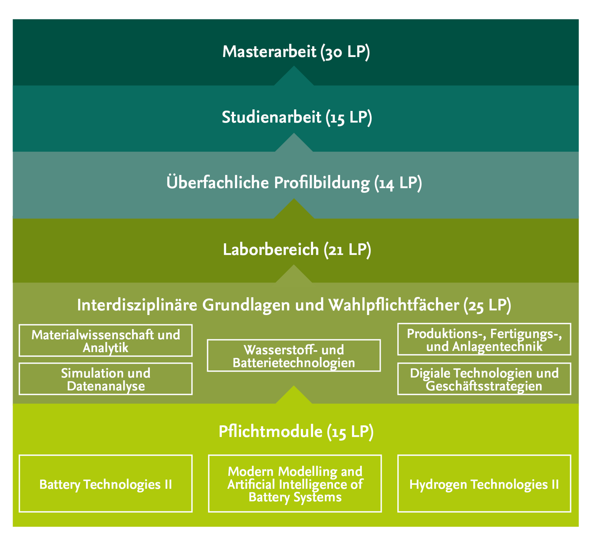 Im Masterstudium belegen die Studierenden drei englischsprachige Pflichtmodule. Diese bauen auf den Grundlagen der Batterie- und Wasserstoffforschung auf und bilden die Basis für die weiteren Studieninhalte. Der Großteil des Masterstudiums jedoch besteht aus Lehrveranstaltungen, die nach eigenem Interesse ausgewählt werden. Dank einer Fülle an Wahlmöglichkeiten bildet jede:r Studierende ein persönliches Profil und damit eine individuelle Spezialisierung – je nachdem, was zu den eigenen Interessen und sprachlichen Stärken passt.