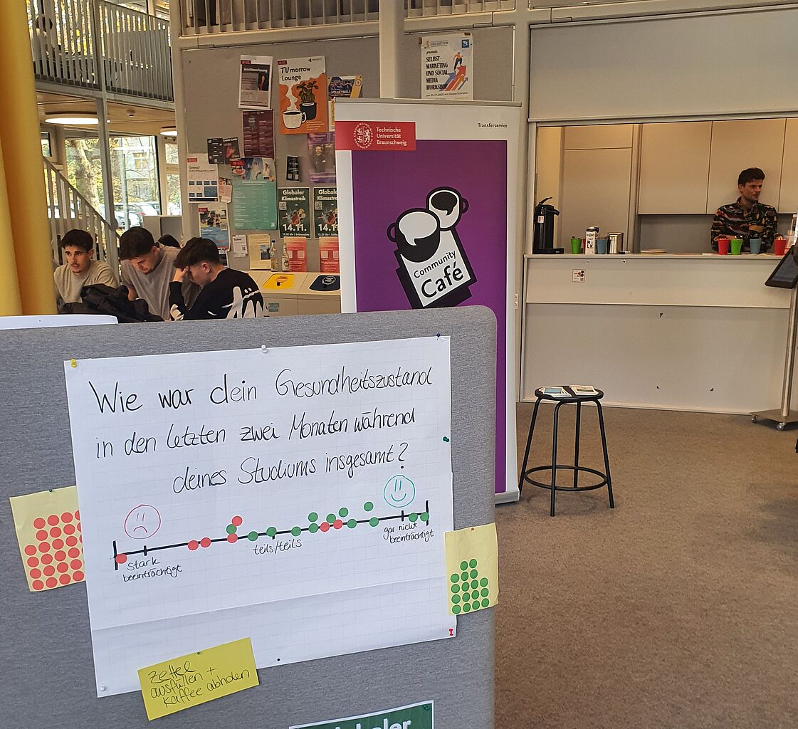 Am 12. November waren wir gemeinsam mit dem Sandkasten-Team im Rahmen der Gesundheitswoche im Studierendenhaus, um mit Euch und allen Interessierten in entspannter Atmosphäre über die ersten Ergebnisse unserer Studierendenbefragung „Wie geht's dir?“ zu diskutieren. Bei einem kostenlosen Kaffee wollten wir Eure Anregungen und Ideen sammeln, wie das Studium an der TU Braunschweig verbessert und beispielsweise die Gesundheit der Studierenden gefördert werden kann.
