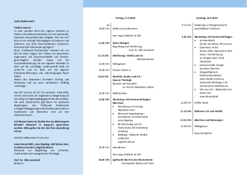 Das RPI bietet auch in diesem Jahr wieder eine Tagung bzw. einen gemeinsamen "Treffpunkt für Studierende" an, der dieses Mal unter dem Motto "Vielfalt und ich" steht und in Kooperation mit den Mentoren der Ev.-luth. Landeskirche Hannovers und kirchlichen Studierendenbegleitungen durchgeführt wird.