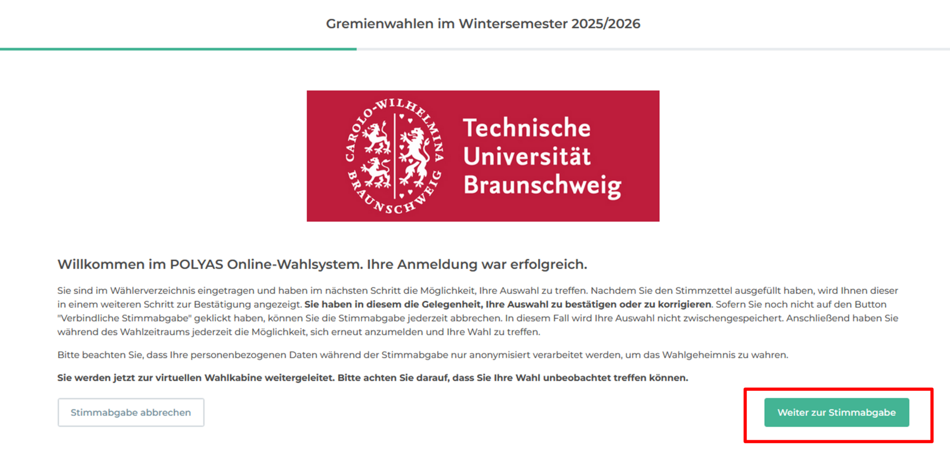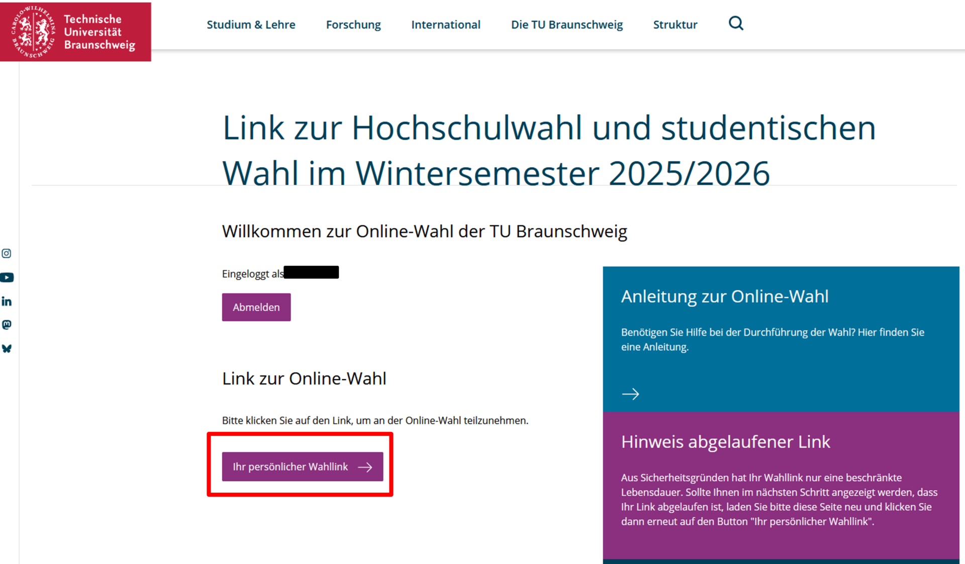 Sie sind nun auf der Webseite der TU Braunschweig angemeldet. Im unteren Bereich der Webseite finden Sie einen Button mit dem Text "Ihr persönlicher Wahllink". Nach Klick auf diesen Button gelangen Sie in das eigentliche Wahlsystem.